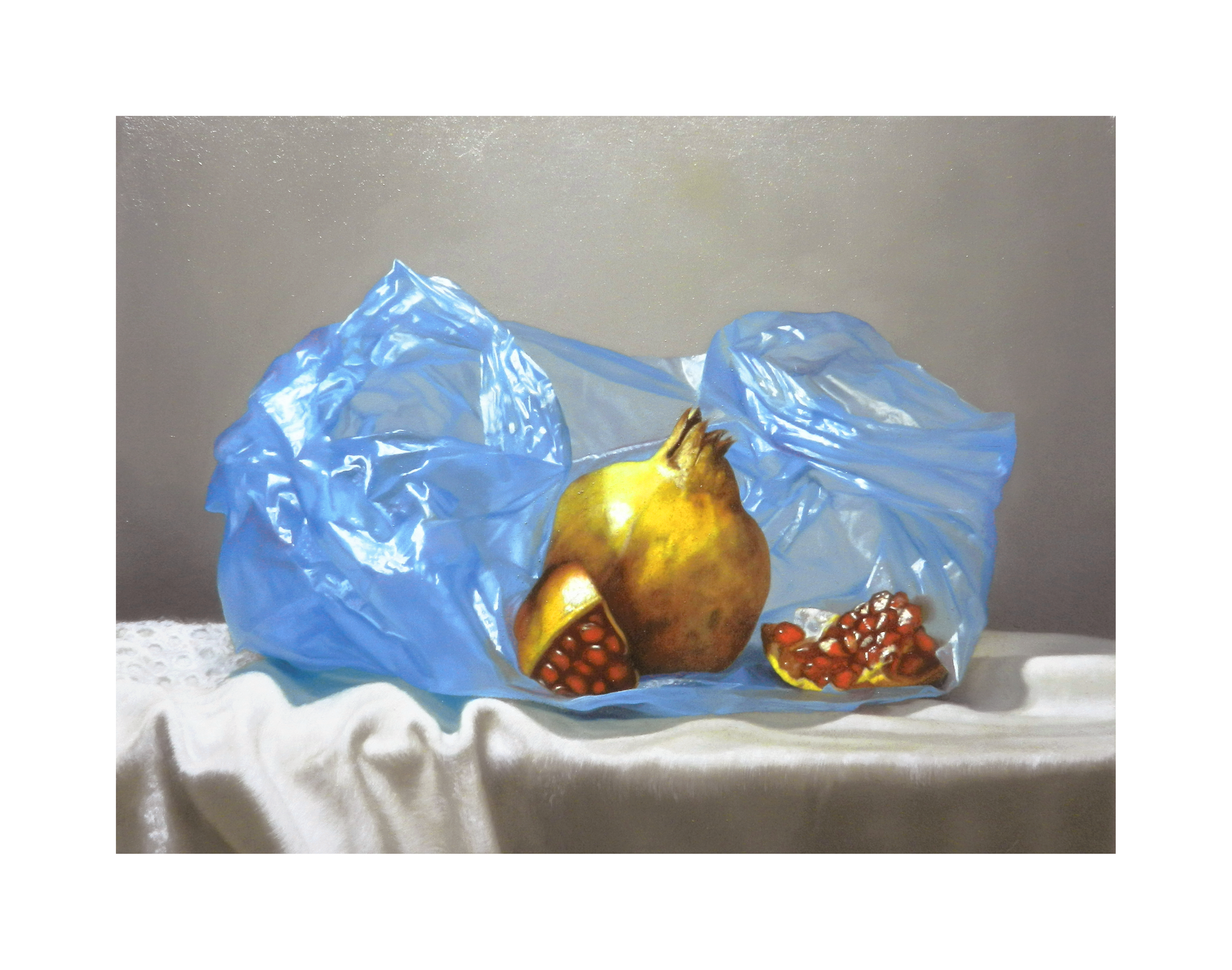 Comencé esta obra en una época en la que las bolsas plásticas estaban por desaparecer de nuestro día a día. Personalmente, siempre he admirado el diseño y la variedad de colores de estas bolsas, en especial ese azul vibrante que resalta sutilmente la fruta. Sin embargo, no puedo ignorar el alto costo ambiental que implica su uso. Aunque el plástico es liviano, económico y versátil, debemos recordar que su impacto en la naturaleza es sumamente grave.