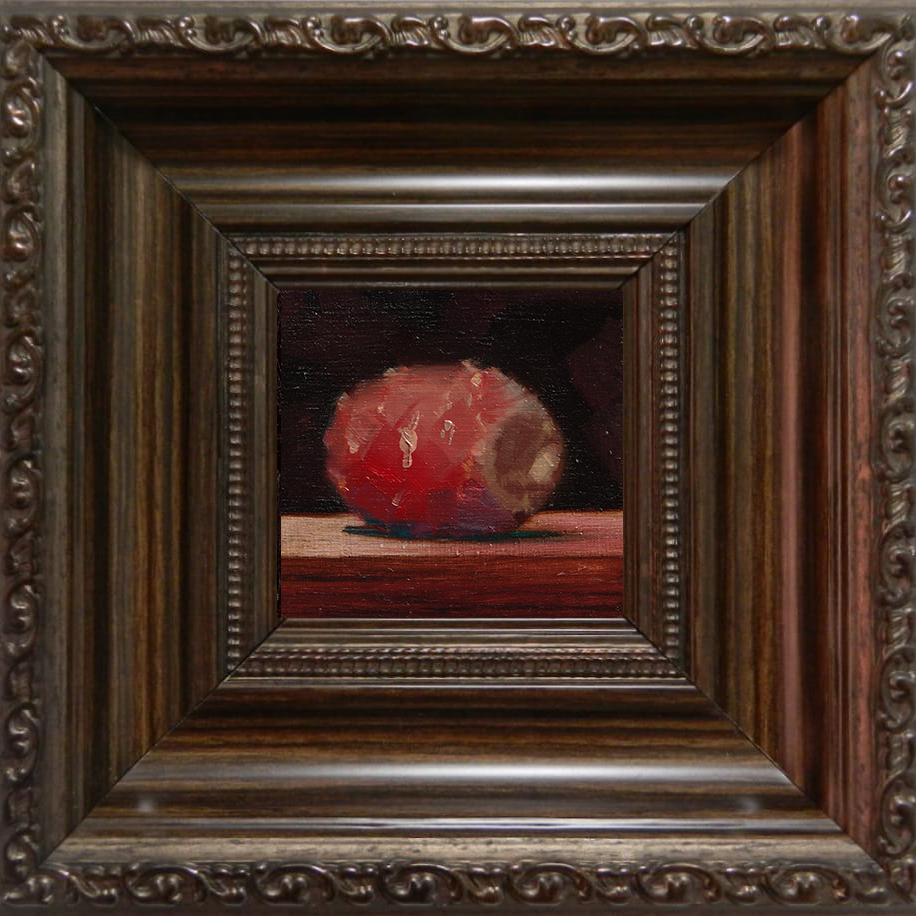 Un gajo de granada reposa sobre un bloque de mármol. La luz destaca el color rojo natural de la fruta. Realizada al natural, gracias a la técnica de pintura directa.